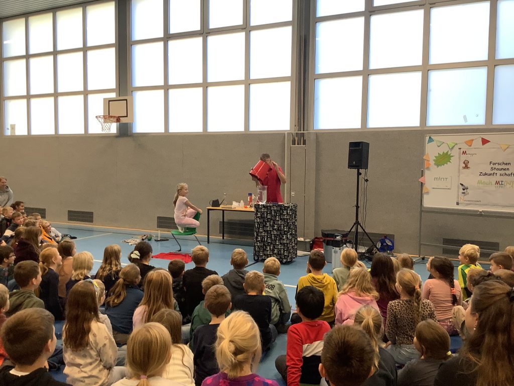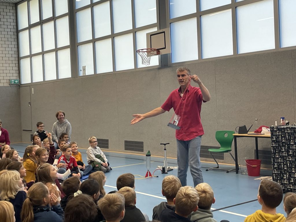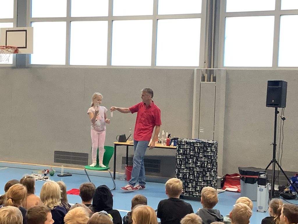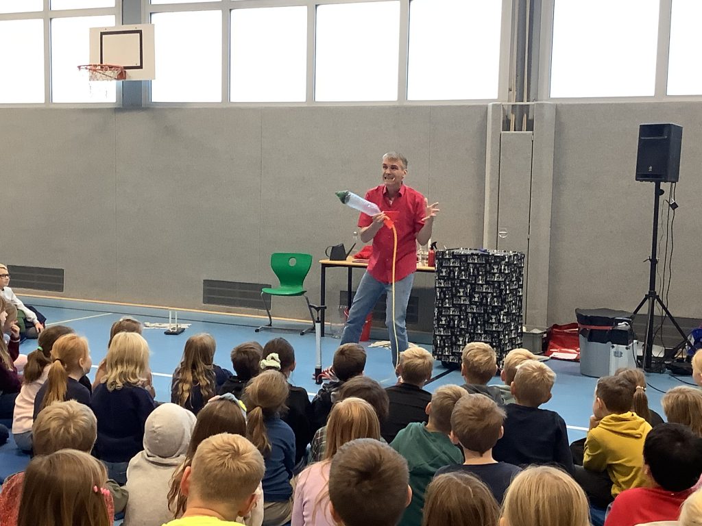 Herr Ott begeisterte mit seiner faszinierenden Show rund um die vier Elemente – Feuer, Wasser, Luft und Erde. Anschaulich hat er Naturwissenschaft mit Unterhaltung verbunden und gezeigt, dass Physik alles andere als langweilig ist. Mit beeindruckenden Experimenten wurde die Turnhalle zur Bühne für spektakuläre Physik: Die Kinder erlebten hautnah, dass sich die Anziehungskraft durch Fliehkraft „ausschalten“ lässt und auch die Wirkung des Luftdrucks wurde eindrucksvoll demonstriert.