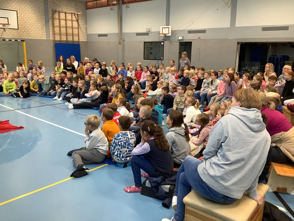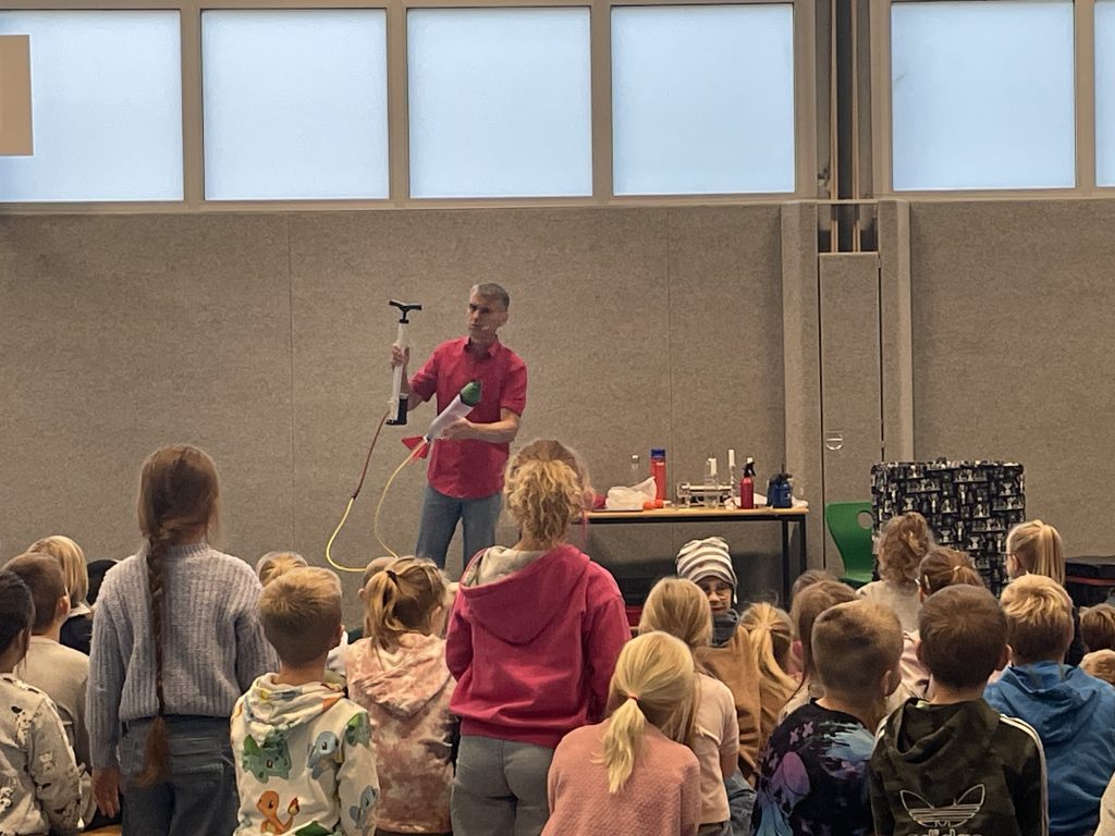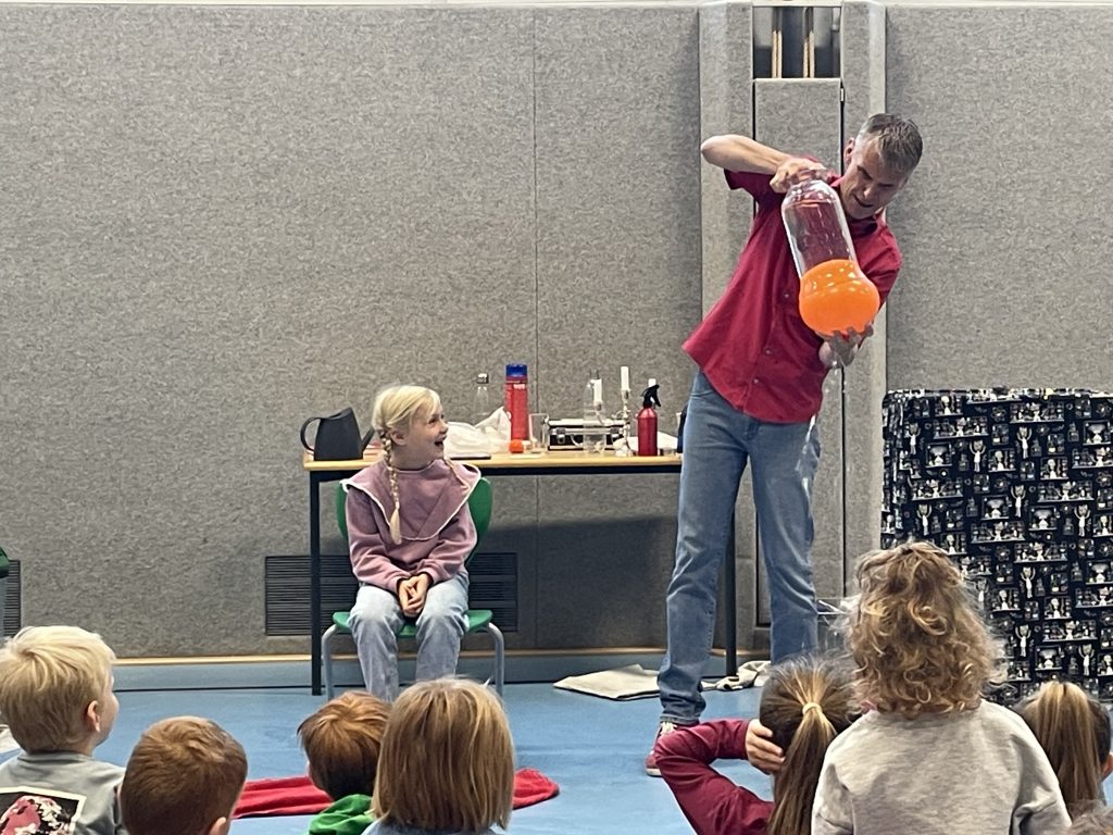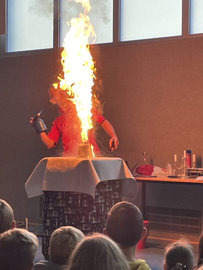 Herr Ott begeisterte mit seiner faszinierenden Show rund um die vier Elemente – Feuer, Wasser, Luft und Erde. Anschaulich hat er Naturwissenschaft mit Unterhaltung verbunden und gezeigt, dass Physik alles andere als langweilig ist. Mit beeindruckenden Experimenten wurde die Turnhalle zur Bühne für spektakuläre Physik: Die Kinder erlebten hautnah, dass sich die Anziehungskraft durch Fliehkraft „ausschalten“ lässt und auch die Wirkung des Luftdrucks wurde eindrucksvoll demonstriert.