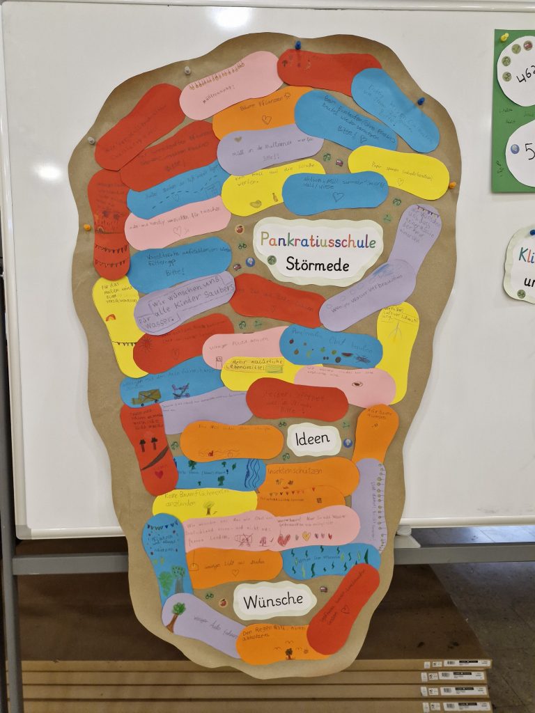 Die ganze Schule beteiligte sich an dieser Aktion. Eine perfekte Aufgabe für die Klima-Scouts. Sie haben in ihren Klassen Ideen und Wünsche zum Klimaschutz gesammelt und diese im Rahmen der AG auf einem großen Plakat in Form von “Wunschfüßen” notiert und gestaltet. Am Ende waren die Kinder verdientermaßen sehr stolz auf die Präsentation der “Wunschfüße”, die klare Forderungen an die Politik enthalten. Dieses Plakat hat sich im November auf den Weg zur Weltklimakonferenz nach Aserbaidschan gemacht.