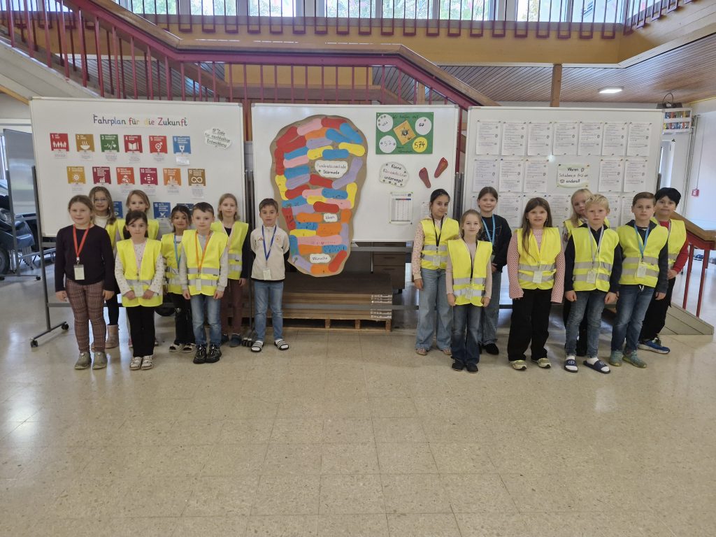 Auch in diesem Jahr waren die Klima-Scouts im Rahmen des Projekts “Grüne Meile – Kleine Klimaschützer unterwegs” wieder aktiv. Die Jungen und Mädchen des zweiten, dritten und vierten Jahrgangs haben ihre Klassen beim Sammeln der grünen, roten und blauen Meilen tatkräftig unterstützt. Das Gesamtergebnis von 3657 grünen Meilen, 449 roten Meilen und 389 blauen Meilen kann sich auf jeden Fall sehen lassen. Zusätzlich haben die Klima-Scouts Wünsche und Ideen der Mitschüler gesammelt und als großen Wunschfuß gestaltet.