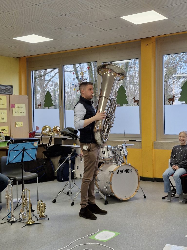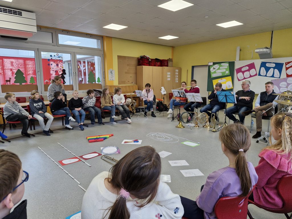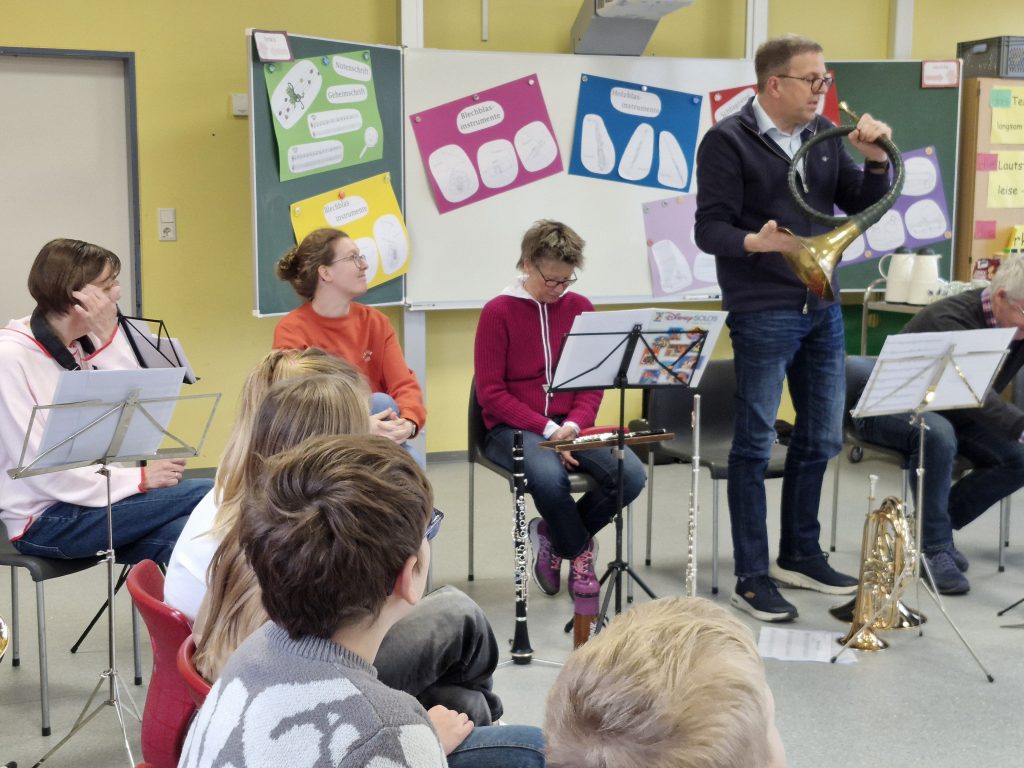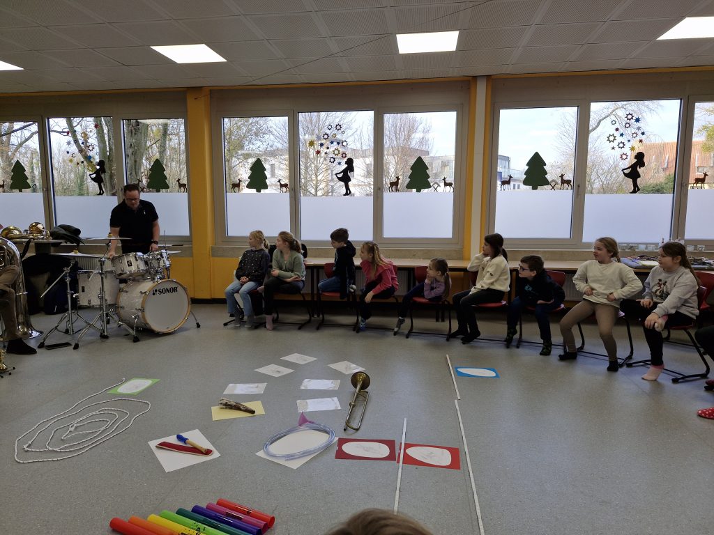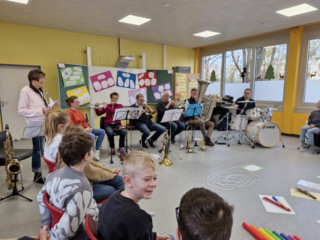 Einen ganzen Vormittag lang war der Musikzug Störmede zu Besuch und stellte den Kindern des 3. Jahrgangs verschiedene Blasinstrumente und das Schlagzeug vor. Dabei lernten die Schülerinnen und Schüler die Funktion von Noten kennen und erfuhren, warum Noten so wichtig sind – denn nur wenn alle nach denselben Noten spielen und gut zusammenpassen, entsteht ein richtiges Musikstück.